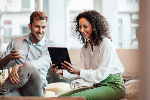 Smiling businesswoman using digital tablet while sitting with colleague at cafe