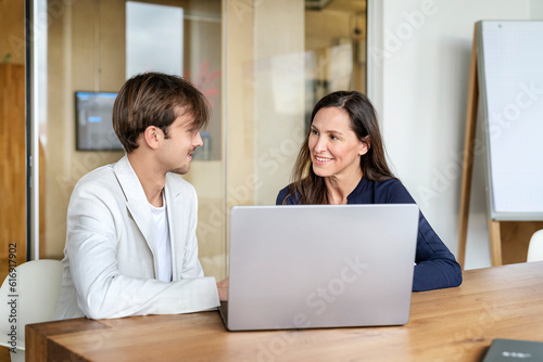 smiling, businesswoman, colleague, sitting, desk, happiness, copy space, technology, 2, people, computer, laptop, communication, adult, business, woman, man, male, teenage, young, businessman, occupation, job, connection, wireless, strategy, corporate, agency, service, creative, professional, mature, pair, looking, happy, togetherness, caucasian, office, talking, discussion, meeting, female