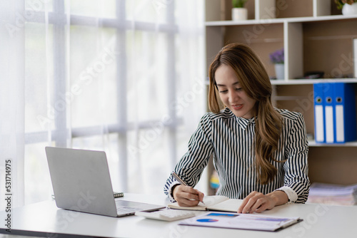 Smiling businesswoman working in office with money chart document and holding pen using laptop sitting on chair at studio in office accounting concept