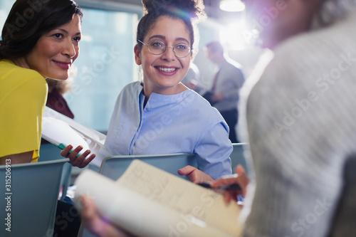 Smiling businesswomen discussing paperwork in conference audience