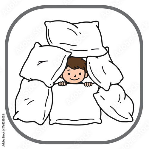 boy, children, children, person, youth, toddler, male, human, character, face, head, hand, playing, hiding, peeking, smiling, looking, building, constructing, happy, cheerful, joyful, playful, fun, imaginative, pillow, fort, castle, den, hideout, structure, cushion, bedding, soft, white, stack, pile, illustration, cartoon, drawing, graphic, icon, symbol, outline, simple, minimal, vector, clip art