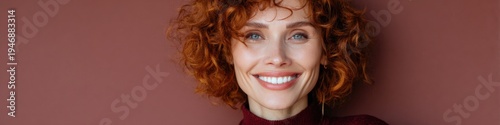 smiling, caucasian, female, young, red, curly, hair, portrait, closeup, burgundy, turtleneck, bright, smile, warm, expression, welcoming, face, head shot, eye, joyful, confident, beauty, model, skin, freckle, attractive, charming, cheerful, happy, radiant, gaze, person, adult, casual attire, cosy, fashion, colours, vibrant, mood, intimate, natural, wholesome, candid, stylish, elegant, lifestyle, single, refined