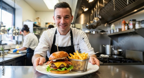 Smiling Chef Presents Delicious Bacon Cheeseburger and Fries in Professional Kitchen