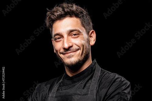 chef, cook, eatery, food, kitchen, culinary, professional, occupation, career, men at work, job, uniform, apron, black, background, portrait, man, male, young, adult, smiling, happy, confident, expertise, skill, talent, passion, cooking, gastronomy, cookery, industry, hospitality, service, profession, employment, work, staff, employee, head, art, dark, studio, shot, looking, camera