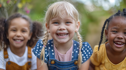 Smiling Children in Colorful Outfits on a Sunny Day, Friendship and Joy, diversity