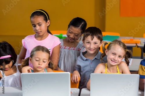 Smiling children using laptops