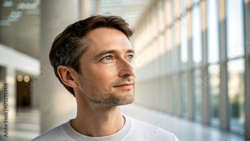 Smiling close-up portrait of one handsome young businessman looking out in the city