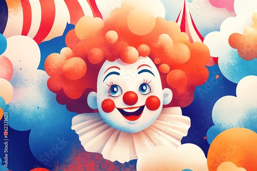 clown, smiling, illustration, red, wig, nose, circus, party, carnival, entertainment, fun, children, childhood, blue, white, orange, festive, graphic, design, portrait, face, make-up, frill, retro, style, cloud, striped, tent, event, cartoon, character, holiday, joy, amusement, playful, costume, artist, drawing, vector, background