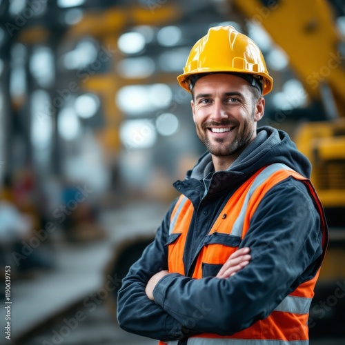 Smiling Construction Worker in Safety Vest and Hard Hat at Industrial Worksite