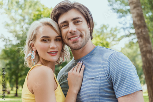 smiling couple hugging and looking at camera in park