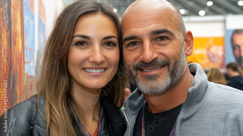 couple, smiling, art, exhibition, portrait, happiness, indoor, event, people, friendship, interaction, joy, together, casual attire, background, colourful, creativity, atmosphere, engagement, community, celebration, male, female, adult, closeup, lifestyle, candid, expression, fun, social, human relationships, modern, artistic, vibrant, cheerful, photo, exhibition hall, culture, connection, warmth, sharing, enjoyment, visitor