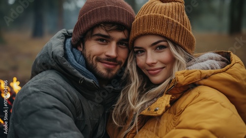 Smiling couple sitting by campfire in cozy winter forest, wearing warm clothes, enjoying nature, romance, outdoor camping, love, snow, peaceful retreat