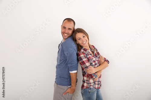 couple, man, woman, boy, guy, girl, white background, studio, isolated, copy space, love, smiling, happy, happiness, adult, people, 30s, 30s, european, smile, boyfriend, girlfriend, fun, teenage, modern, trendy, casual attire