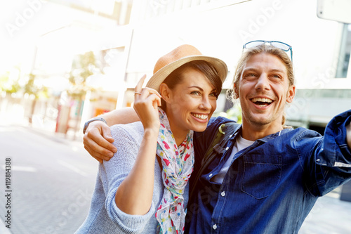 camera, holiday maker, fun, happiness, selfie, self, portrait, self-portrait, city, travel, standing, holiday, pointing, landmark, sunglasses, examining, checking, architecture, woman, vacation, outdoors, showing, looking, couple, journey, man, photographer, viewing, summer, photograph, photo, adventure, human hand, town square, playing, two people, smiling, equipment, funny, holding, laughing, open mouth, playful, digital camera, memory, urban scene, people traveling