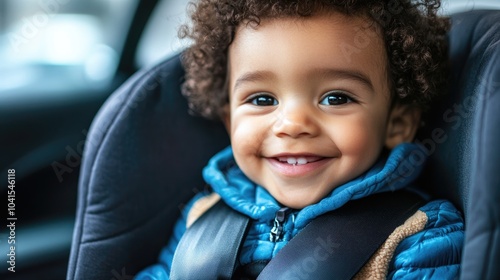 Smiling curly haired baby boy secured in a child car seat with safety straps representing the idea of safe travel and life protection