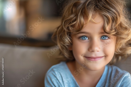 smiling curly haired boy gazing at the camera with bright blue eyes warm soft lighting and cheerful mood concept of child care, lifestyle, education