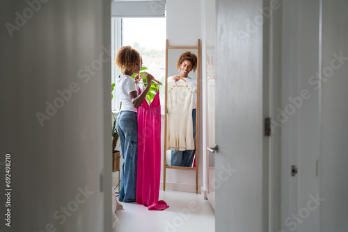 Smiling curly woman trying on clothes and looking at her reflection at mirror