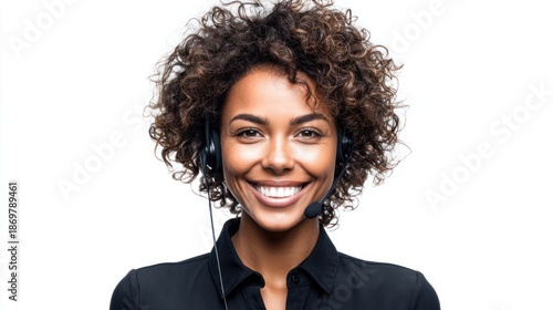 client, service, support, representative, headset, smile, woman, call, center, phone, cheerful, happy, communication, business, contact, operator, assistance, help, desk, online, beautiful, curly, hair, face, portrait, isolated, white, background, professional, friendly, confident, success, positive, attractive, person, adult, african, american, black, female, looking, talking, earphones, microphone, agent, working, studio, closeup, telemarketing