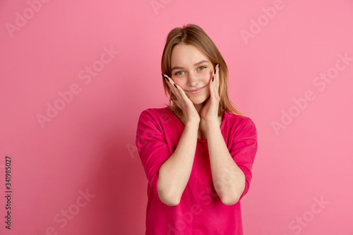 Smiling cute, happy. Caucasian young woman's portrait isolated on pink studio background, monochrome. Beautiful female model. Concept of human emotions, facial expression, sales, ad, trendy.