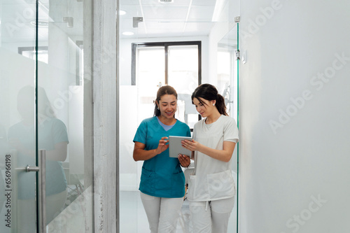 smiling, dentist, discussing, colleague, tablet, clinic, copy space, multicultural, technology, 2, people, computer, communication, adult, online, group, woman, digital, dental, surgery, medicals, practice, health care, medicine, hospital, scrub, orthodontist, doctor, men at work, nursing, staff, occupation, job, working, multi-ethnic, wireless, connection, using, cyberspace, young, pair, sharing, walking, holding, latin, american