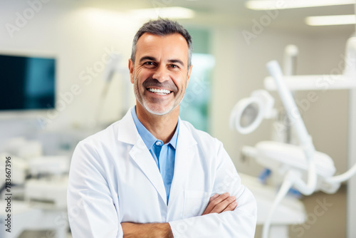 Smiling dentist doctor, portrait of innovation in dentistry, background