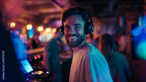 dj, nightlife, music, party, glow, smile, technology, earphones, club, young, male, crowd, celebration, fun, illuminated, entertainment, sound, vibrant, style, casual attire, lifestyle, youth, joyful, emotion, scene, happy, people, dance, excitement, urban, bar, social, friends, life events, mixer, setup, colourful, light, background, copy, space, copy space, copy space