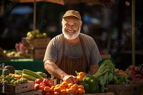 Smiling elderly man selling fresh vegetables at a farmers' market