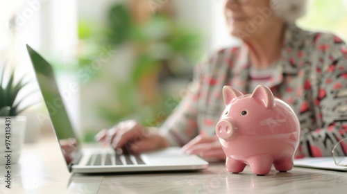 Smiling elderly woman, a pink piggy bank, and a laptop, with a blurred background of plants