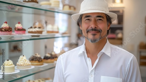man, entrepreneur, bakery, dessert, cupcake, pastry, cake, shop, owner, smiling, hat, white shirt, epicure, sweet, food, display, indoor, retail, business, client, professional, chef, men at work, elegant, cheerful, inviting, hospitality, culinary, treat, delicious, baked goods, showcase, pastry shop, modern, warm, cosy, boutique, tasteful, creative, friendly, welcoming, artistic, fresh, food industry, eatery
