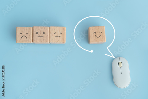 smiling face on wooden cube block inside speech bubble frame with white computer mouse for customer service evaluation and satisfaction survey, human resource recruitment, mental health concepts