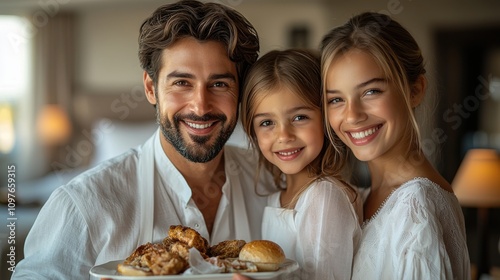 Smiling family of three holding a plate of delicious food, enjoying quality time together in a cozy and warm home environment.