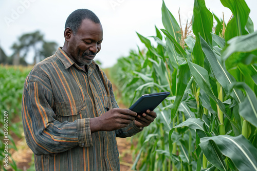 Smiling farmer using digital tablet in lush green cornfield for modern agricultural analysis and crop management