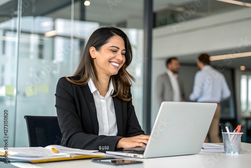 Smiling Female HR Manager Using Laptop at Work Desk in Corporate Office"