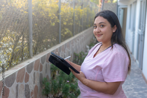 smiling, nurse, woman, latina, scrub, health care, standing, professional, happy, young adult, female, fence, natural light, modern, technology, portrait, half face, relaxed, health, cheerful, summer, corridor, caregiver, staff, practitioner, tablet, communication, clinic, wellness, sunlight, work, people