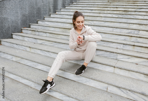 Smiling fit woman resting while sitting on stone stairs and looking at smart bracelet