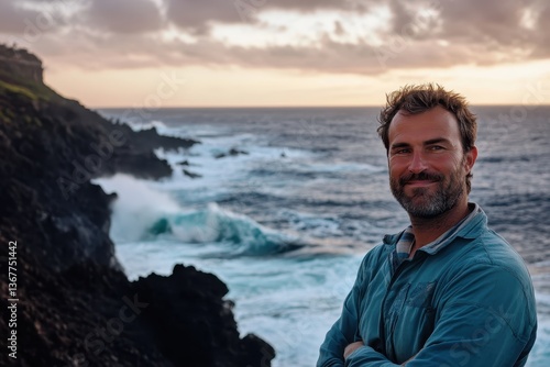 geologist, ocean, wave, crashing, coast, rocky, sunset, smile, smiling, man, scientist, geology, nature, landscape, seascape, power, strength, water, rock, cliff, evening, twilight, cloud, sky, outdoors, exploration, discovery, research, environment, travel, adventure, scenic, picturesque, beauty