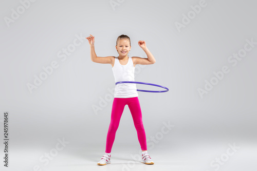 Smiling girl doing exercises with hula hoop