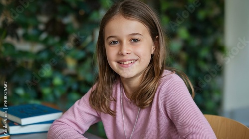 Smiling Girl in Front of Books: A young girl with a vibrant smile sits at a table with a stack of books in front of her, highlighting the joy of learning and a passion for education.