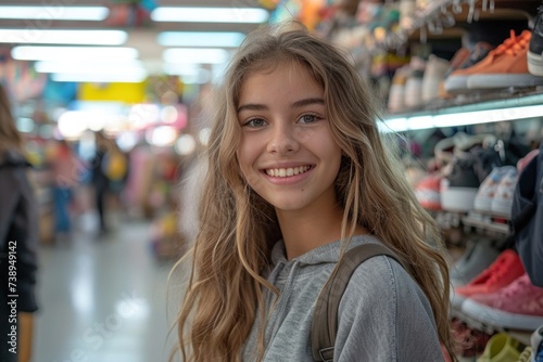 Smiling girl in shoe store bright portrait of fashionista