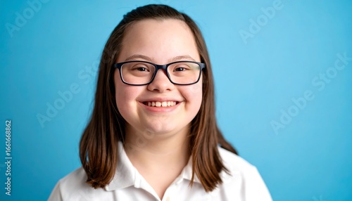 girl, children, portrait, studio, person, smiling, happy, positive, portraiture, teenage, young, woman, blue, background, caucasian, student, friendly, goggles, smiling face, inclusive, diversity, joy, school, photo, closeup, smiling girl, missy, light blue, image, people