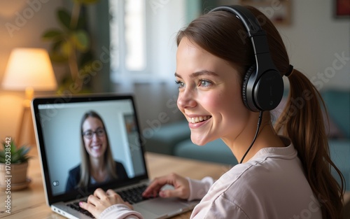 Smiling girl student elearning online on laptop watching webinar at home. Happy young woman wearing headphones using computer remote working, having web conference meeting, virtual class, web seminar.