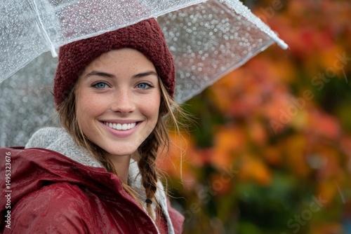 Smiling girl with blue eyes under clear umbrella enjoying a rainy day among vibrant autumn leaves in a park