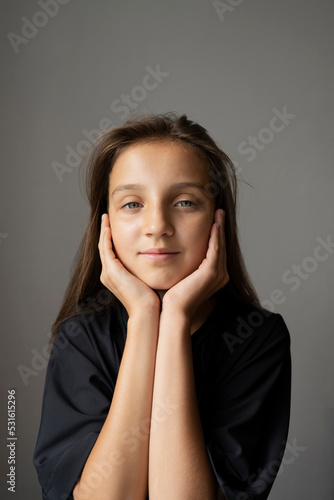 smiling, girl, head, hand, grey, individuality, copy space, 1, people, children, preteen, plain, leisure, staring, face, beauty, caucasian, lifestyle, touching, skin, bodycare, female