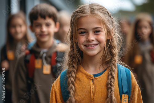 Smiling girl with long hair and backpack looks at camera.