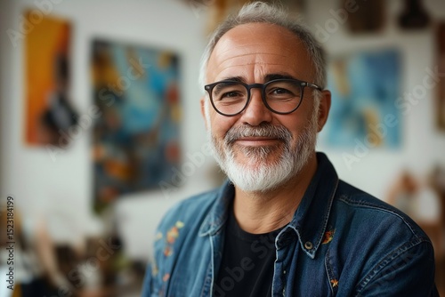 Smiling Gray-Bearded Artist Portrait in Creative Studio with Modern Artistic Background. A Candid Celebration of Age Positivity and Craftsmanship