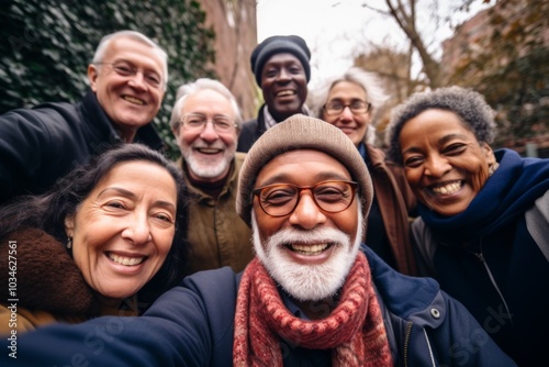 Smiling group portrait of diverse seniors taking selfie in the city