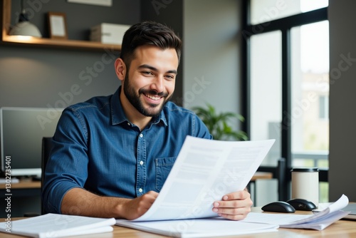 Smiling Hispanic Male Professional Reviewing Documents in Modern Office Setting During Daylight with Computer and Office Supplies Nearby