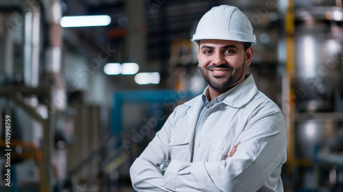 Smiling industrial worker in a white hardhat and protective clothing standing confidently in a brightly lit factory.