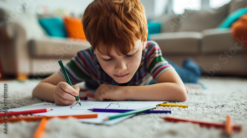 smiling little kid doodling with a pen and paper, drawing and writing on a white page in a school, colourful, coloring a page