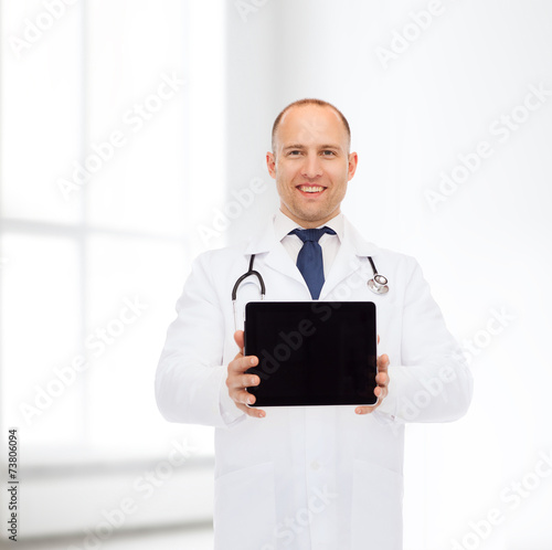 smiling male doctor with stethoscope and tablet pc